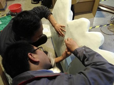 組裝也不是那么輕松的黏在一起就行了的,我們要考慮到最終的效果和在運輸過程之后絕對的安全,我們先做了一個鋼結構支架,然后將這數(shù)十個模塊固定到支架上去。利用數(shù)模分割是設置的鏈接結構和強力膠水,完成拼接組裝,最后修復表面的縫隙。