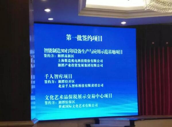 會(huì)議的簽約儀式中,上海數(shù)造機(jī)電科技股份有限公司作為第一家簽約公司,將在湘潭市高新區(qū)智造谷,成立3D打印設(shè)備生產(chǎn)及示范應(yīng)用基地(擬成立湖南數(shù)造公司),總投資為3000萬(wàn)元。將以3D打印設(shè)備生產(chǎn)、3D掃描及打印服務(wù)、3D設(shè)備應(yīng)用示范、3D學(xué)院(3D教育)、行業(yè)云平臺(tái)服務(wù)為主要職能。