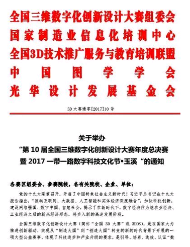 第10屆全國三維數(shù)字化創(chuàng)新設(shè)計(jì)大賽年度總決賽暨2017一帶一路數(shù)字科技文化節(jié)定于2017年12月6日至12月9日在云南省玉溪市盛大舉辦。“數(shù)造杯”數(shù)字化創(chuàng)意設(shè)計(jì)與智能制造(3D打印)大賽作為主活動(dòng)之一,將于12月6日-12月9日同期舉行?,F(xiàn)將相關(guān)活動(dòng)具體安排通知如下: